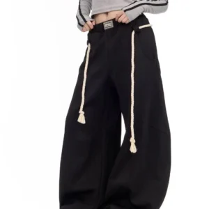 Black Drawstring Casual Pants Women Street Retro Harajuku Loose Cross Legged High Waist Slim Solid Color Sports Straight Pants